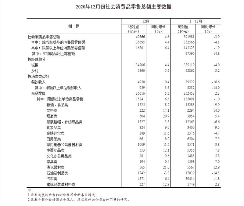 四季度,社会消费品零售总额同比增长4.6%,比三季度加快3.7个百分点。此外,四季度限额以上单位通讯器材类、化妆品类、金银珠宝类商品零售额同比分别增长26.0%、21.2%、17.3%,消费升级类商品销售增速加快。