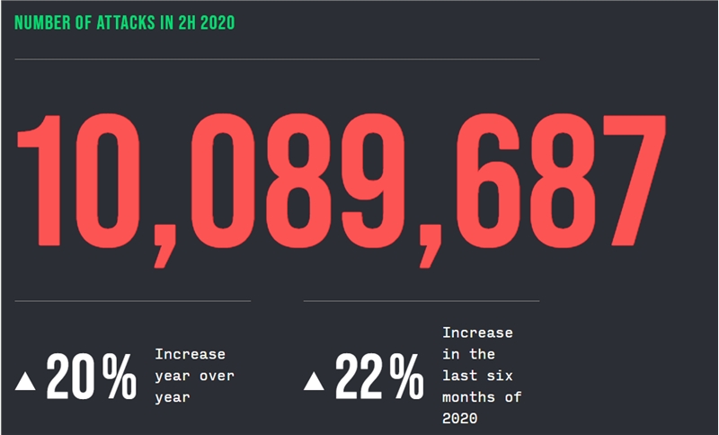同时,单月发起的 DDoS 攻击数也达到了 929,000次,创历史新高;月度平均 DDoS 攻击数量比2019年的平均水平高出10万至15 万次。总的来说,从2019年到2020年,DDoS 攻击数量增加了20%。2020年下半年的攻击尤为集中,攻击数量激增了22%。