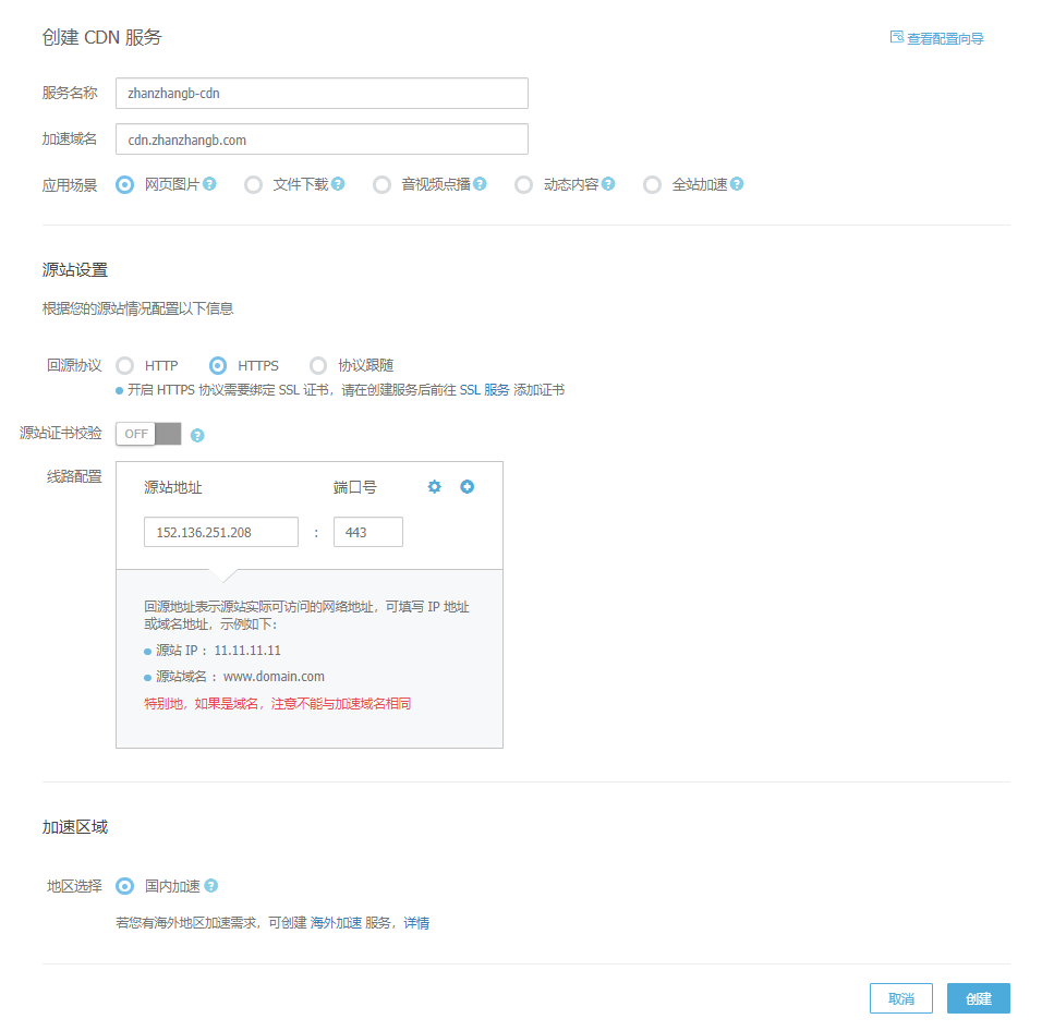 - 服务名称:唯一标识服务,例如:zhanzhangb-cdn,一个服务下面可以绑定多个自有域名。