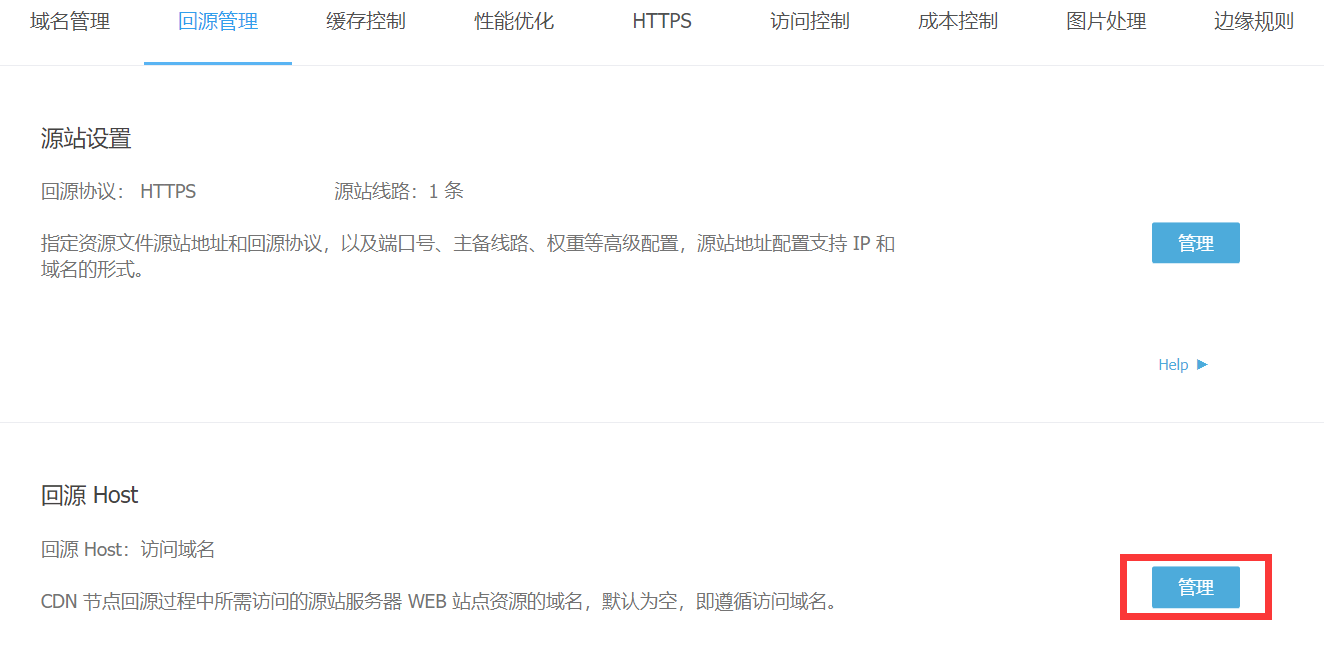 在又拍云的CDN服务管理中,先配置好回源Host,如下图: