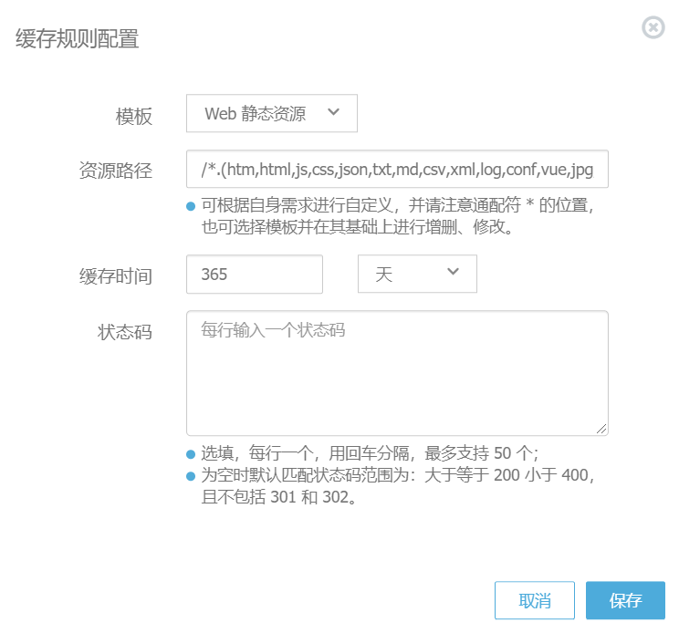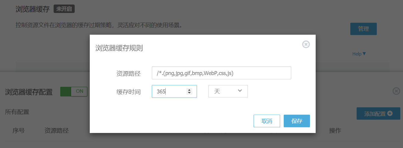 如果已经在准备工作阶段设置了网站的静态资源设置缓存时间,这里就不需要再进行设置了。在未设置缓存过期规则时,CDN 会默认遵循源站的缓存规则。