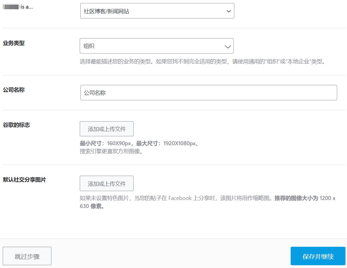 接下来,按提示选择网站类型以及LOGO,然后点击”Save and Continue”。
