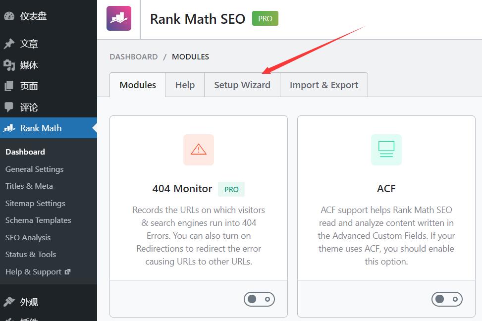 启用 Rank Math SEO 与 Rank Math SEO PRO 后,在Rank Math SEO仪表板中,启动Setup Wizard(安装向导),如下图: