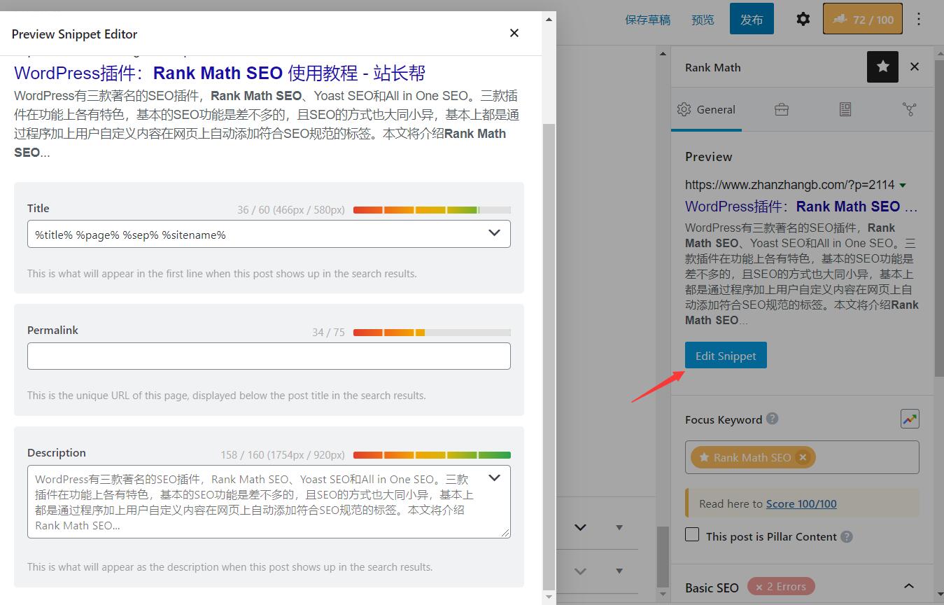 简洁但功能强大的用户界面会在帖子编辑界面显示有关帖子的重要SEO信息。使用此信息,可以立即改进帖子的 SEO。