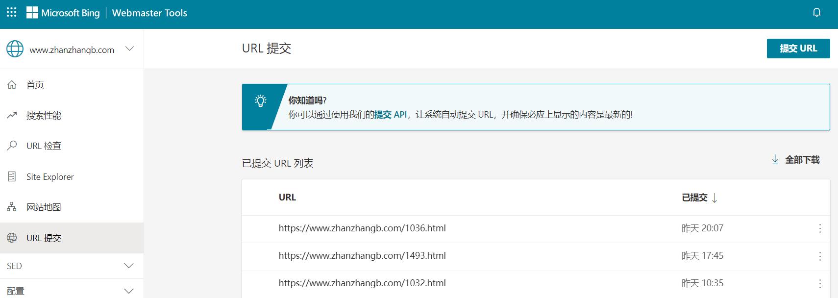 在必应搜索引擎的管理员工具中,可以查看提交效果: