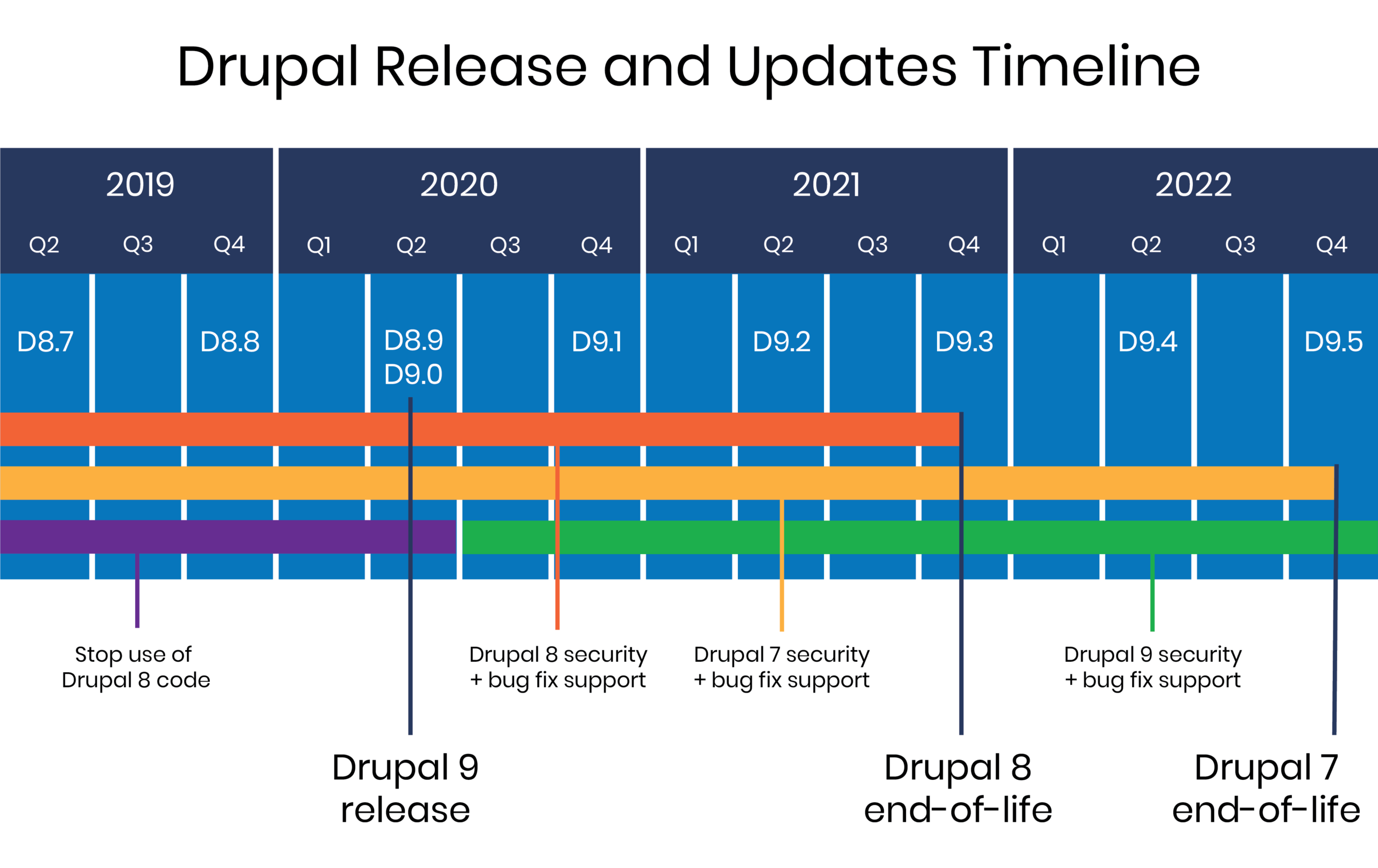 此外,9.3.x 之前的任何 Drupal 版本都已达到生命周期结束状态,这意味着它们不再接收安全更新,因此使用起来存在风险。