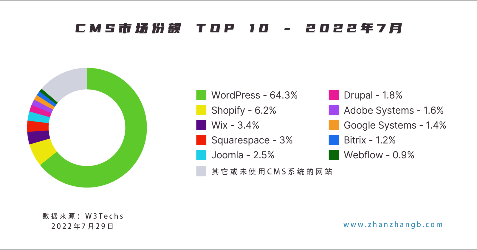 WordPress 在 CMS 市场份额中依然占据主导地位,并于2022年7月蚕食了Shopify部分份额,而其他内容管理系统几乎没有变化。总体而言,WordPress依然是64.3%的网站首选CMS。