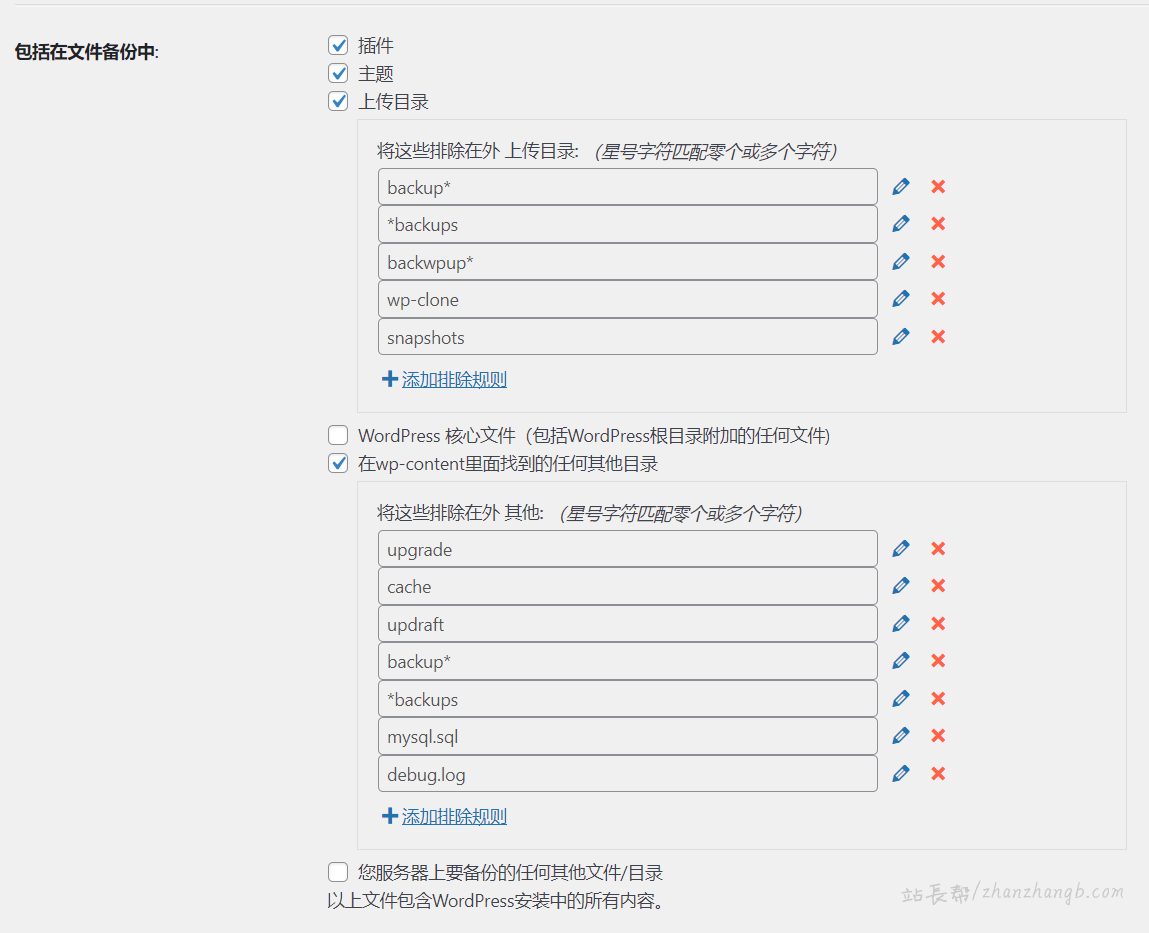 有静态缓存的网站,可以将缓存目录排除在外。以WP-Rocket 缓存插件为例,可以排除/wp-content/cache/wp-rocket目录。