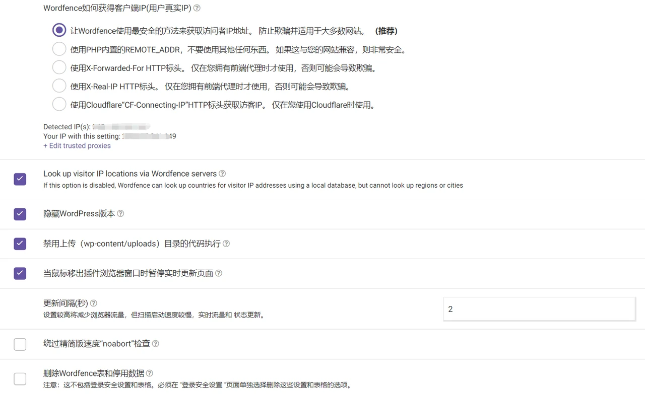 “Wordfence > 所有选项”菜单中,可以看到插件的所有功能设置选项。Wordfence 插件的默认配置已可适配大部分网站需求,所以需要修改的设置并不多。