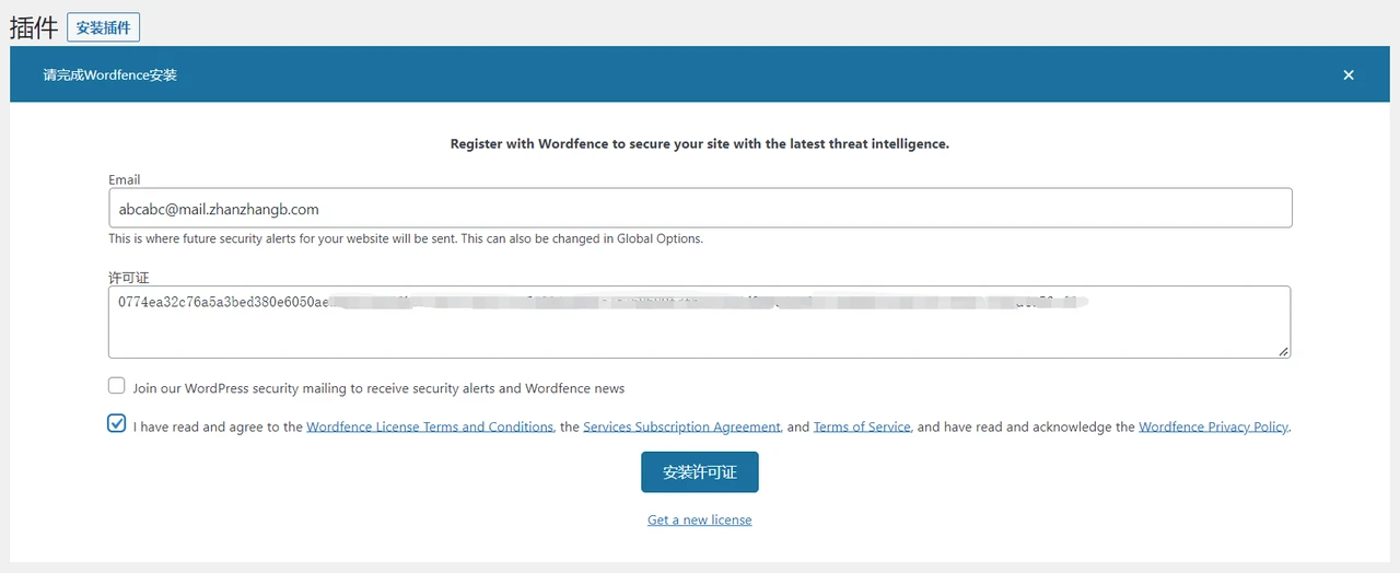 安装并启用 Wordfence Free 版插件后,会提示输入许可证: