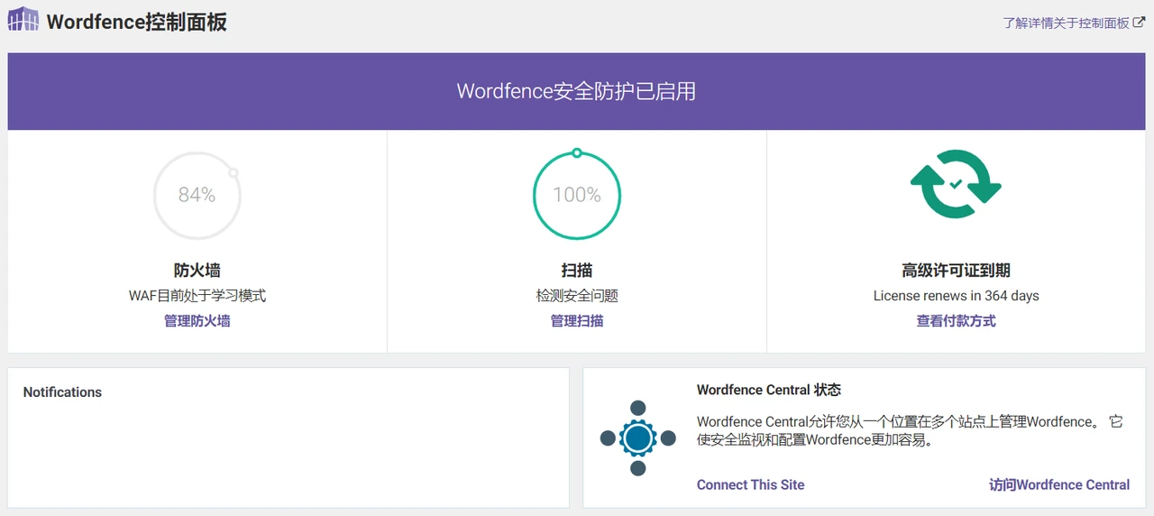 再回到 Wordfence 仪表盘,能看到许可证变成了“高级许可证”,如下图: