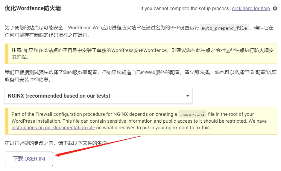 “Wordfence > 防火墙 > 优化Wordfence防火墙”页面中可下载 .user.ini 文件,将该文件上传至网站根目录后,还需在 Nginx 的主机配置文件中添加以下代码(防止该文件被读取或篡改):