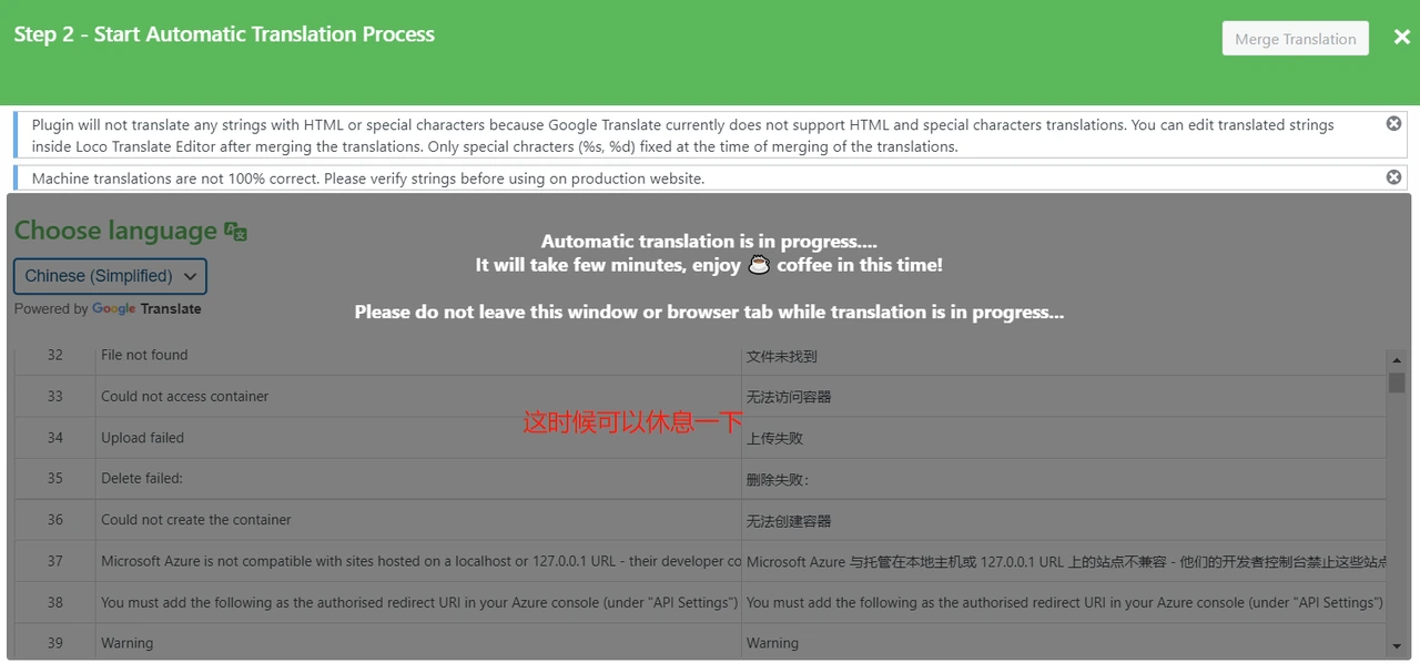点击“ Start Adding Process”按钮后,翻译文本就出现在Loco Translate 翻译插件的编辑界面中。