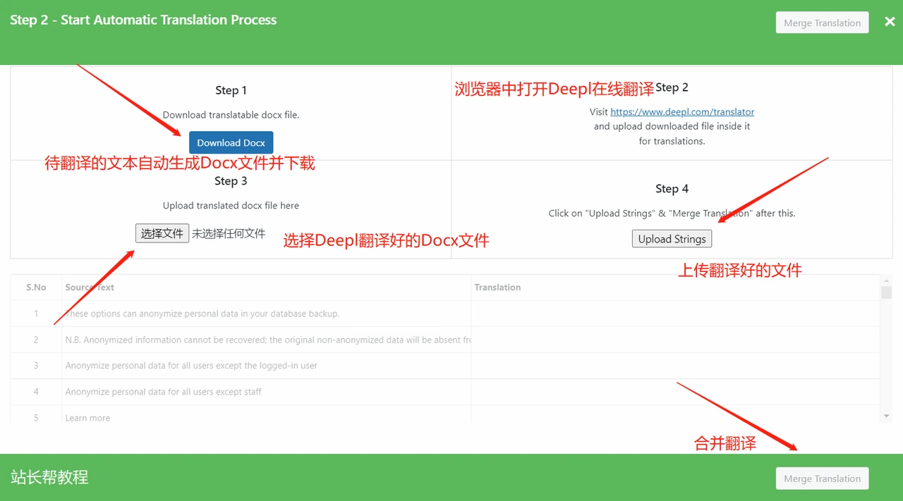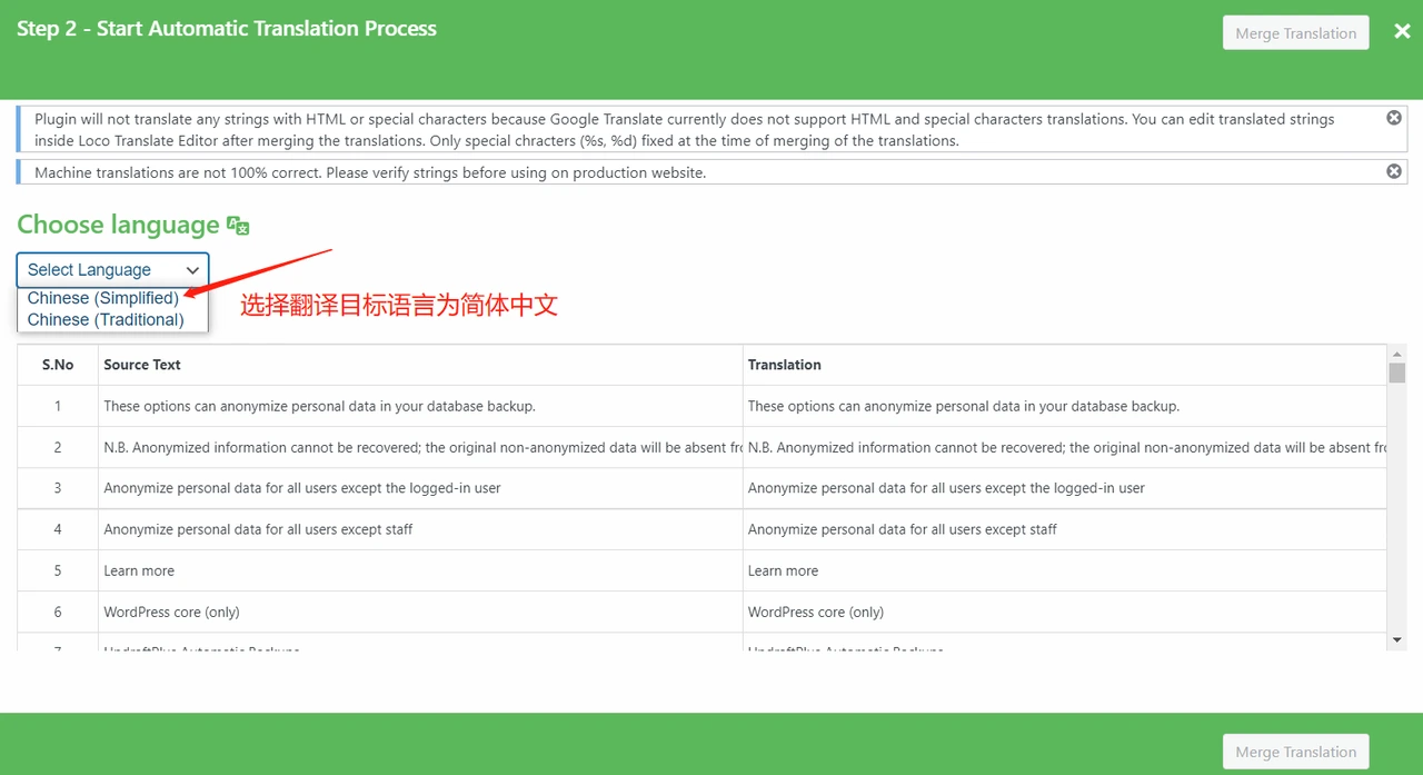 这里需要注意的是,当源文本中包含”%s“或HTML代码,Google Translate 是不会处理的。需要手动翻译,例如:"%s" has no primary key, manual change needed on row %s. 应翻译成:“%s”没有主键,需要手动更改行 %s。