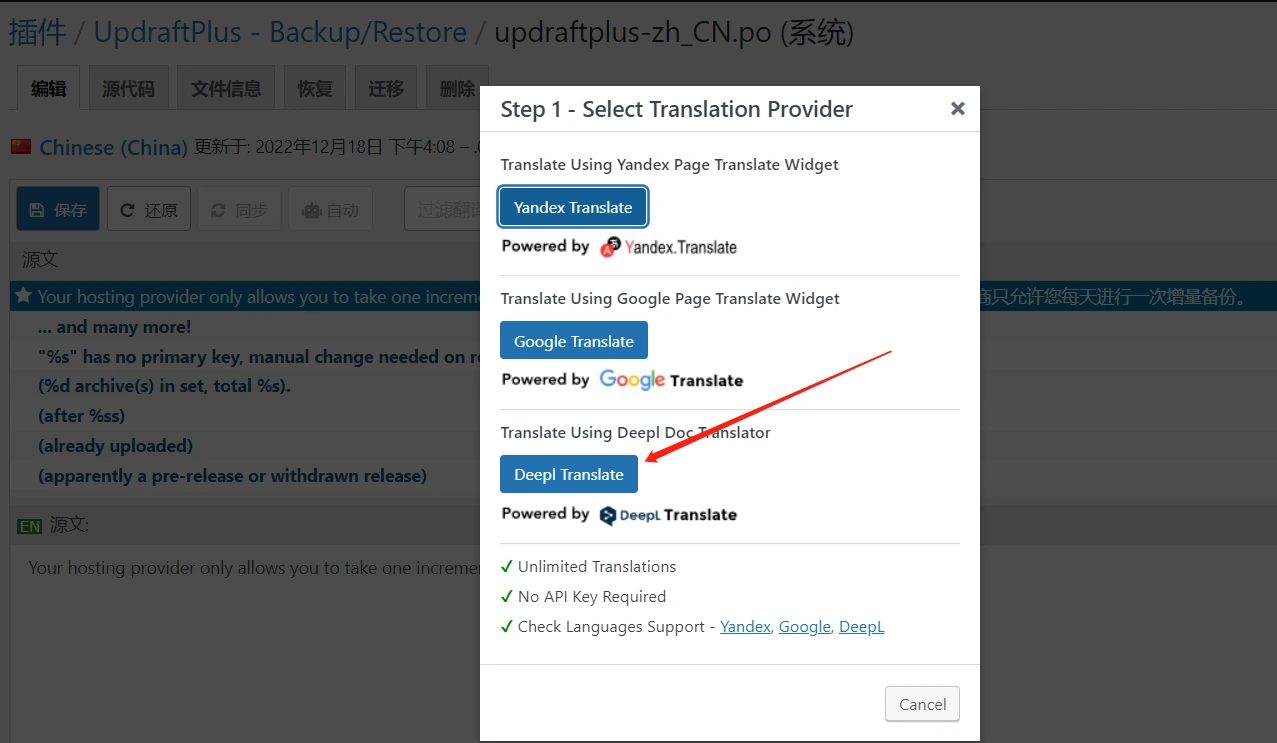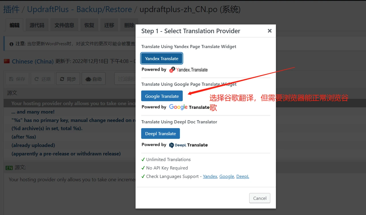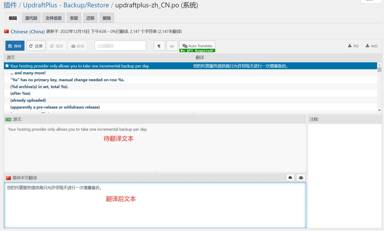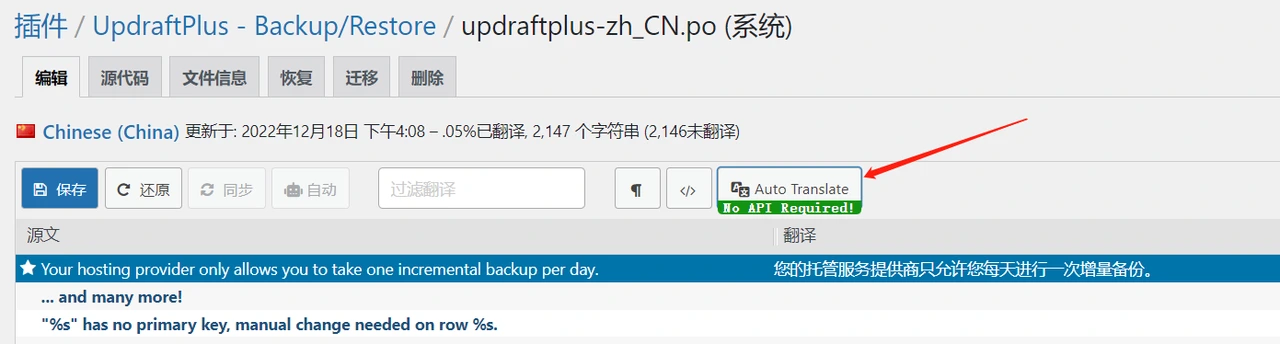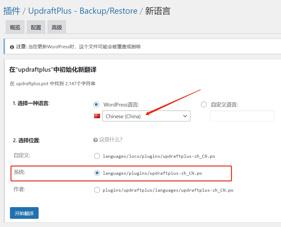 注意:极少数插件只能选择插件的语言目录plugins/updraftplus/languages/才可使翻译生效。