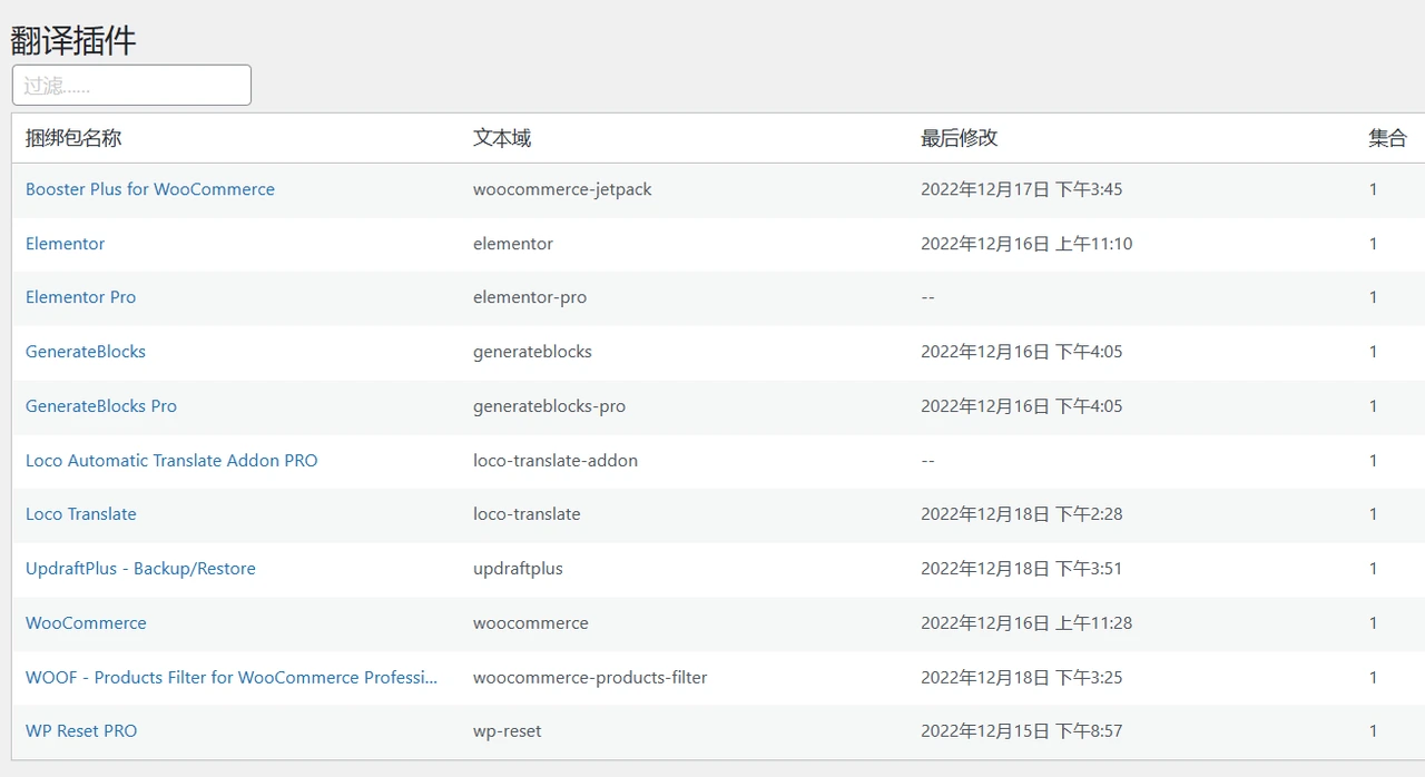启用插件后,在 WordPress 后台 “仪表板 > Loco Translate > 插件”菜单中,能看到所有已安装的插件,点击插件名称即可开始翻译。