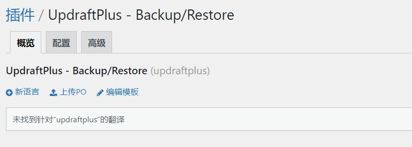 本文以汉化翻译 UpdraftPlus 备份插件为例,点击 UpdraftPlus – Backup/Restore 链接,插件提示未找到该插件的翻译,如下图:
