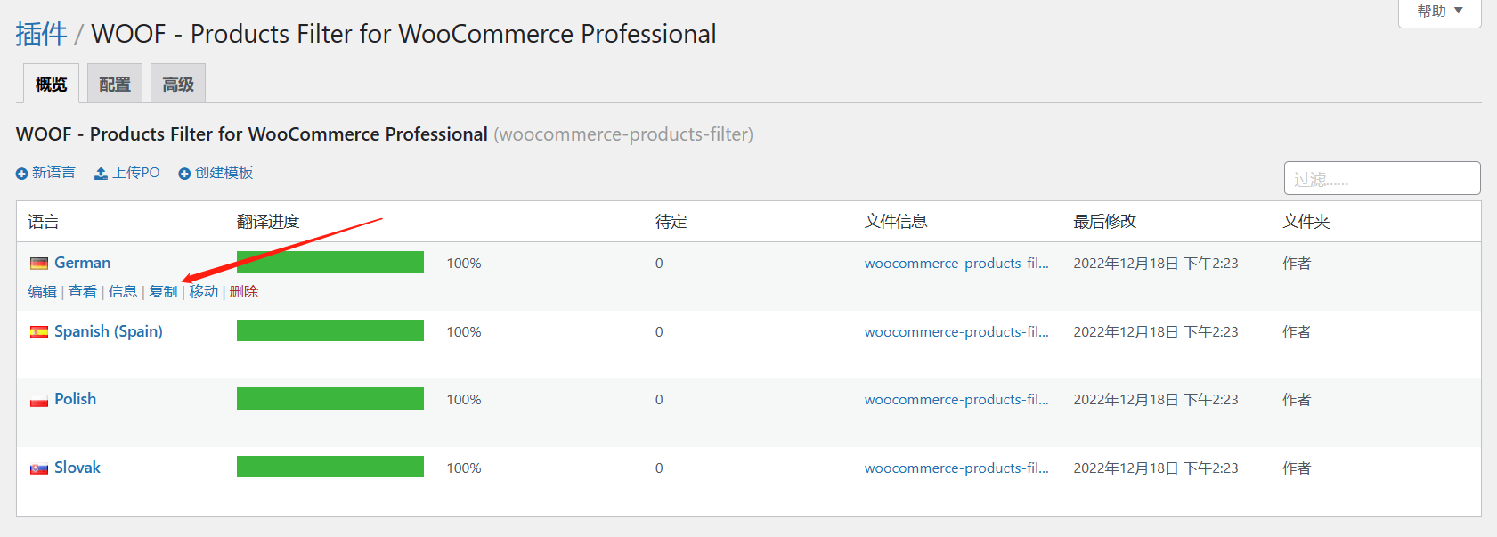 如果翻译后插件或主题的界面中依然是英文,则可以尝试更改一下语言包的存储路径。例如,更改成插件的语言目录plugins/updraftplus/languages/。