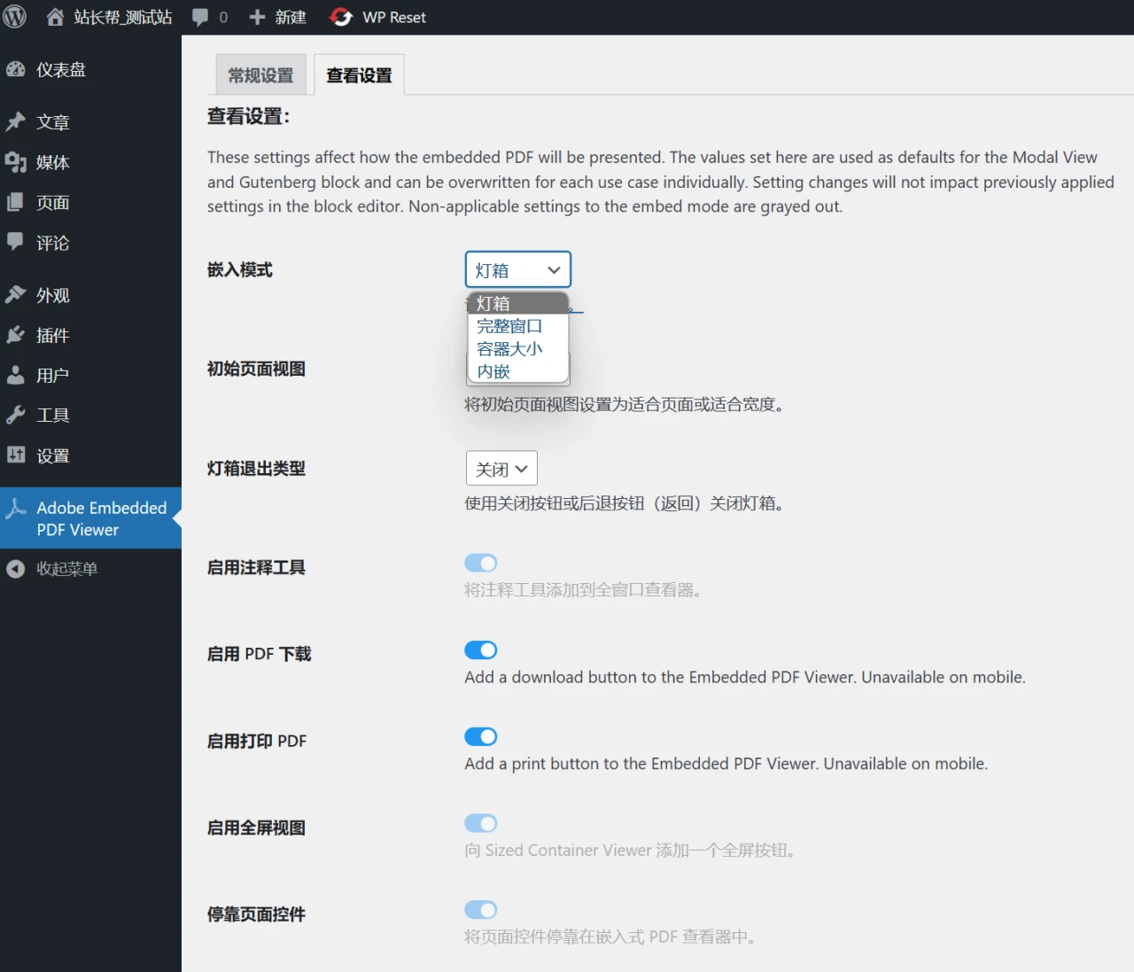 接下来下载 Adobe Embedded PDF Viewer 插件 并安装启用,将下方下载的汉化包上传至wp-content/languages/plugins目录。