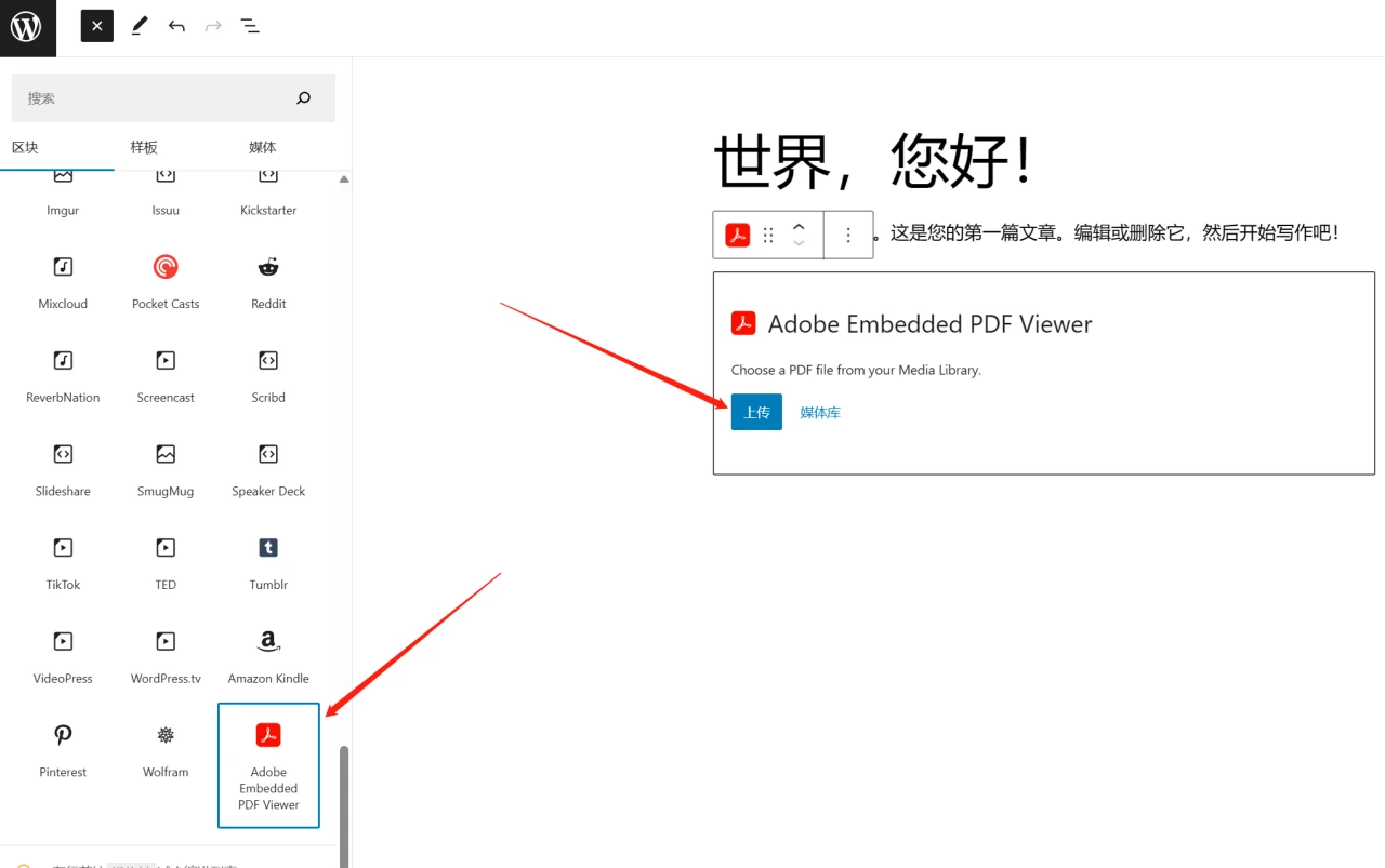 设置好后,就可以在WordPress默认的古腾堡编辑器中插入PDF查看器。