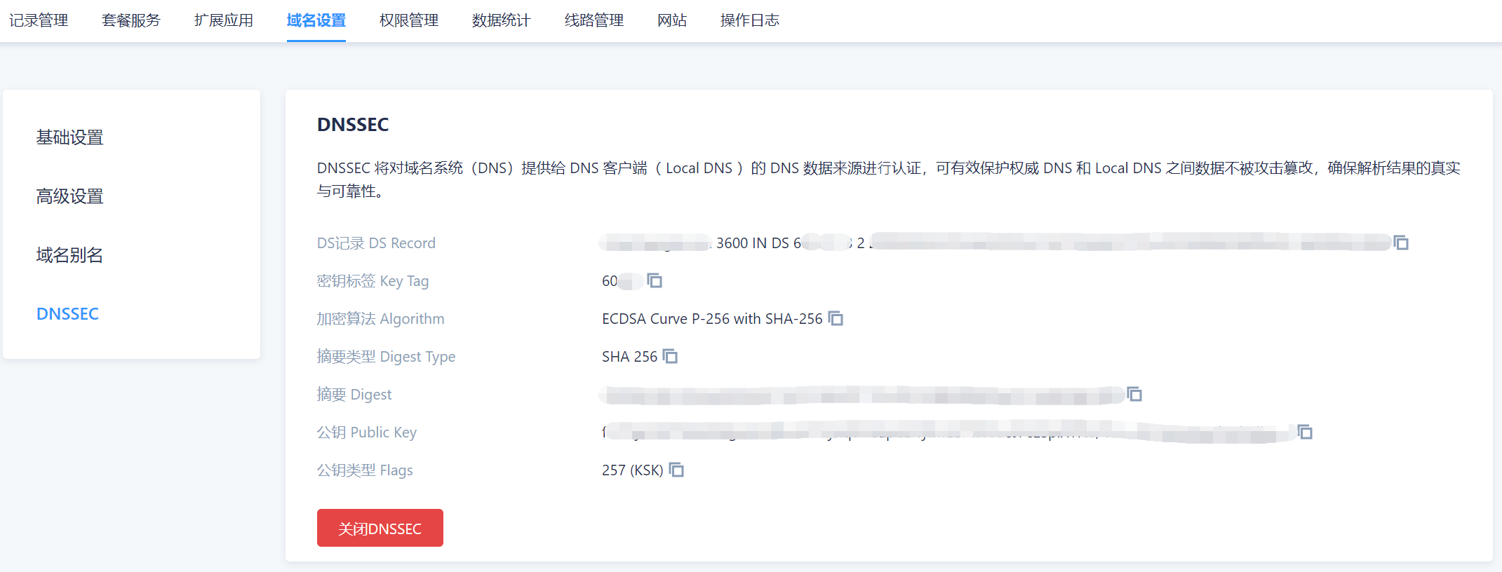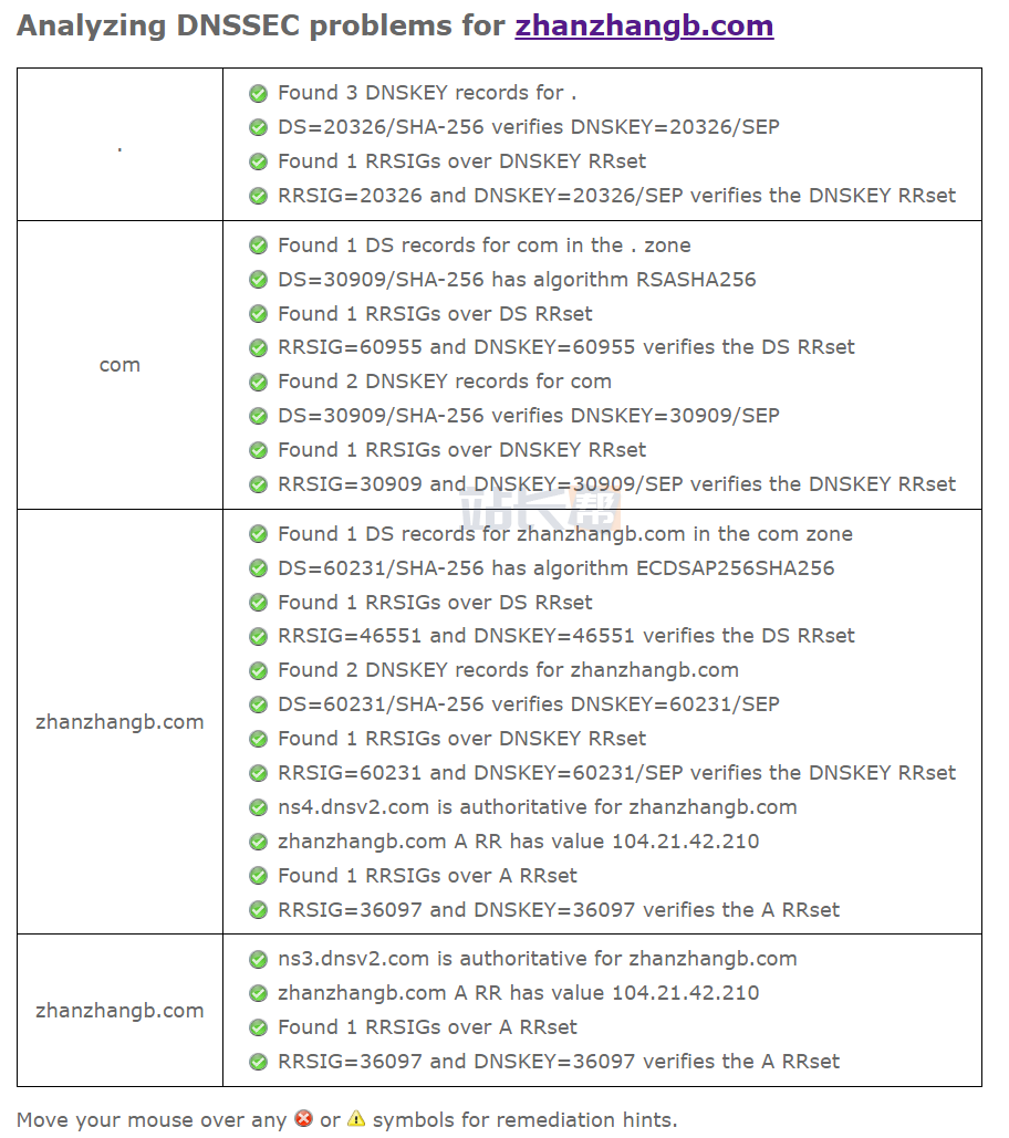 如上图所示,zhanzhangb.com的DNSSEC是已开启并生效的。